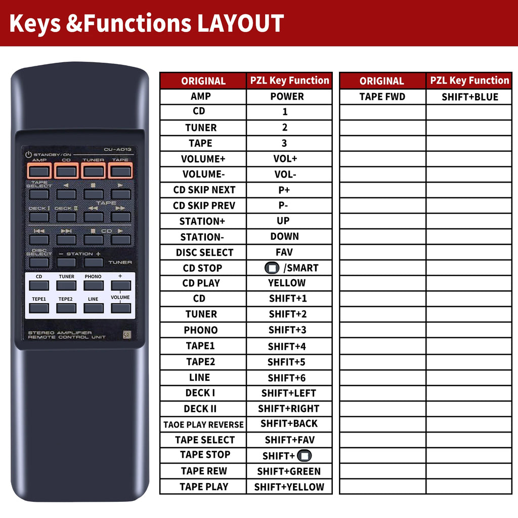 This remote is also commonly used as a successful replacement for discontinued Pioneer integrated amplifier remotes such as CU-A013, often listed regionally as CU-A012 or CU-A014. Many customers use this type of remote with Pioneer A-series amplifiers including A-30, A-50, A-70, and their “-K” variants, where functions such as power, volume, input/source selection, and mute are supported via infrared control.